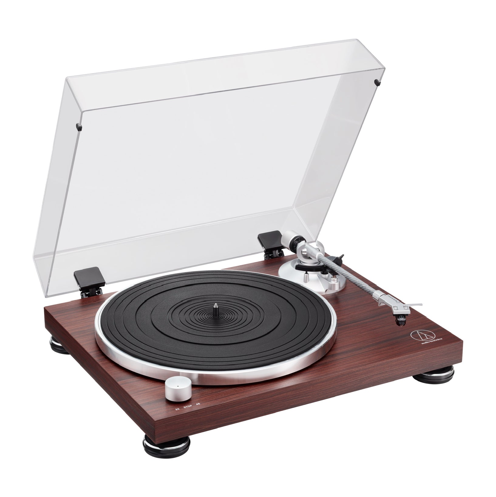 The AT-LPW50BT-RW features an anti-resonance 30 mm thick MDF (medium density fiberboard) plinth, with a stunning rosewood-finished wood veneer, to dampen low-frequency acoustical feedback, and a sensor-monitored motor to ensure accurate platter rotation speeds of 33-1/3 and 45 RPM.